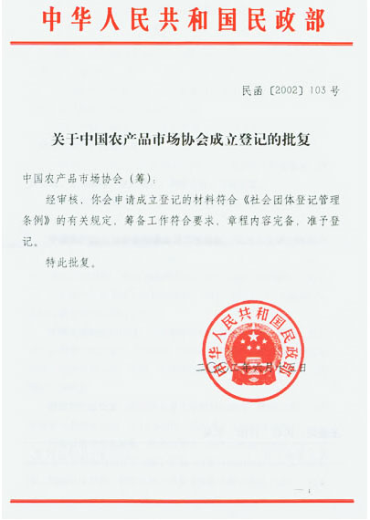 The Chinese Agri-products Marketing Association(CHAMA) is a national social organization legal person set up in June 2002 approved by the Ministry of Civil Affairs. The CHAMA now has a total number of 977 members of the executive council,which are all large-scale agricultural produce wholesale markets with national or regional influence.